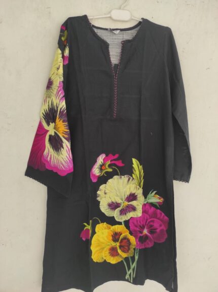 This item is a black Pakistani-style 2-piece suit featuring vibrant yellow and pink pansy floral prints and subtle embroidery. The suit typically includes a cotton or lawn fabric shirt, matching trousers, and an embroidered or printed dupatta (scarf).