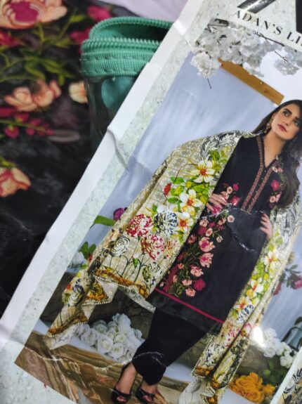 This appears to be a black floral Pakistani or Indian style suit (salwar kameez) with a matching printed dupatta (shawl). The specific item may be a "lawn" suit, which is popular in South Asia for summer wear.Â