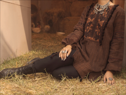 Two Toned Brown Mid-Length Khaddar Shirt, With Embroidered and Stylized Neckline Decorated With Black Tassels. Puffy Sleeves With Slight Detail of Embroidery.