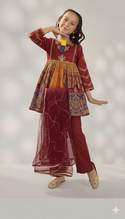 The traditional Pakistani-style outfit in the image is from the brand Junaid Jamshed (J.), which specializes in ethnic and traditional wear for men, women, and children.Â