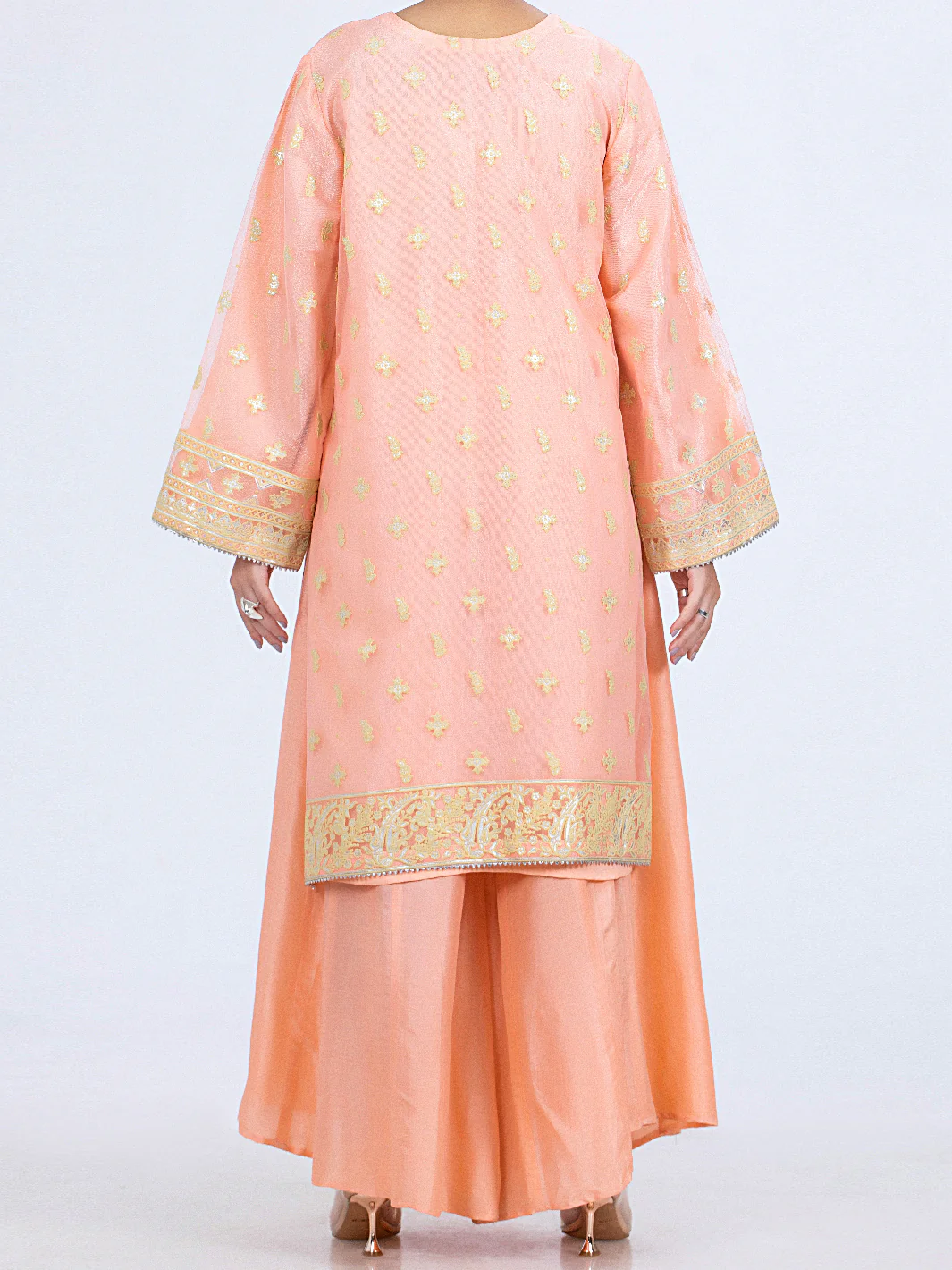 Color & Fabric: Soft apricot shade on a delicate net fabric.