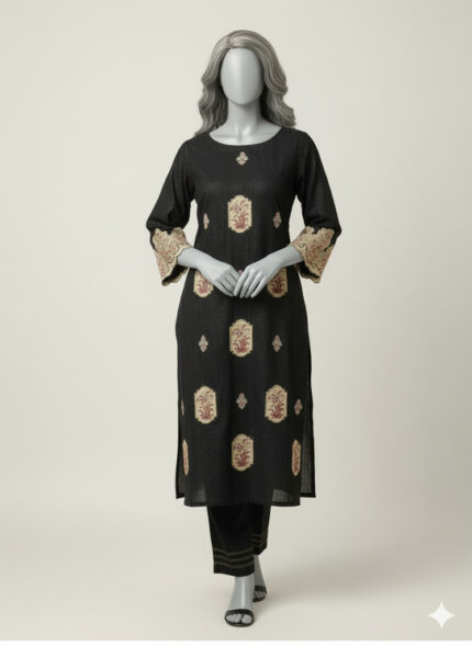 Design Highlight: Features intricate gold embroidery and detailed embellishments, with a prominent central motif.