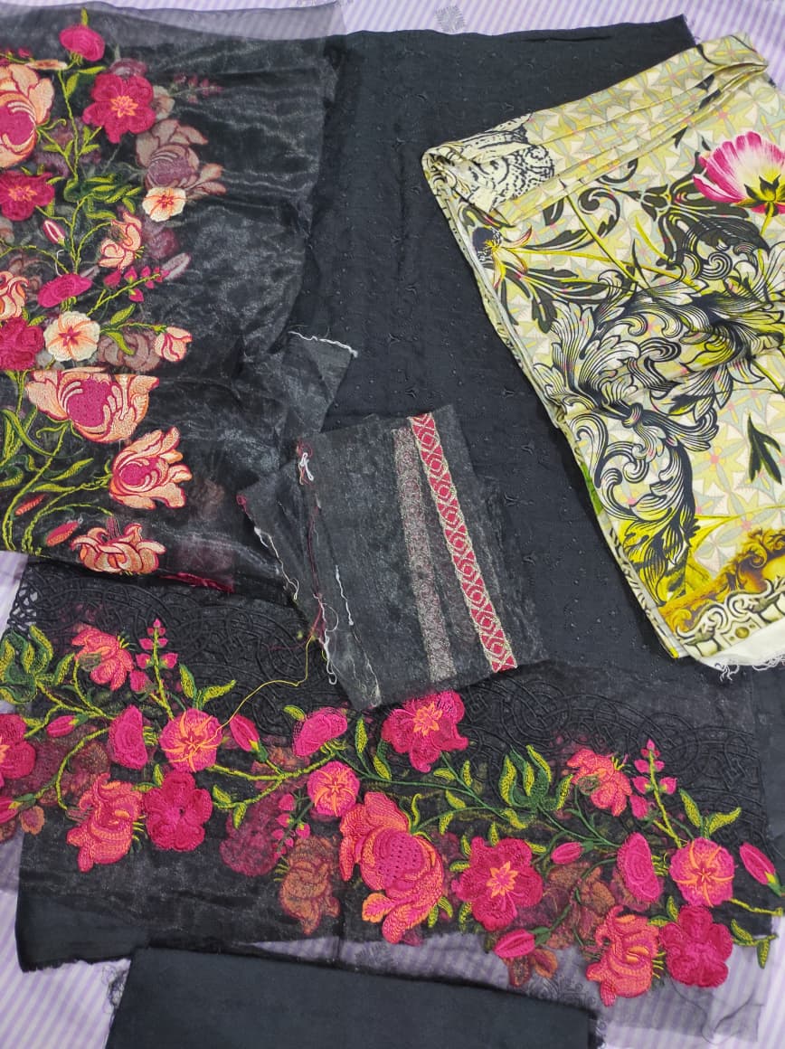 This appears to be a black floral Pakistani or Indian style suit (salwar kameez) with a matching printed dupatta (shawl). The specific item may be a “lawn” suit, which is popular in South Asia for summer wear.Â