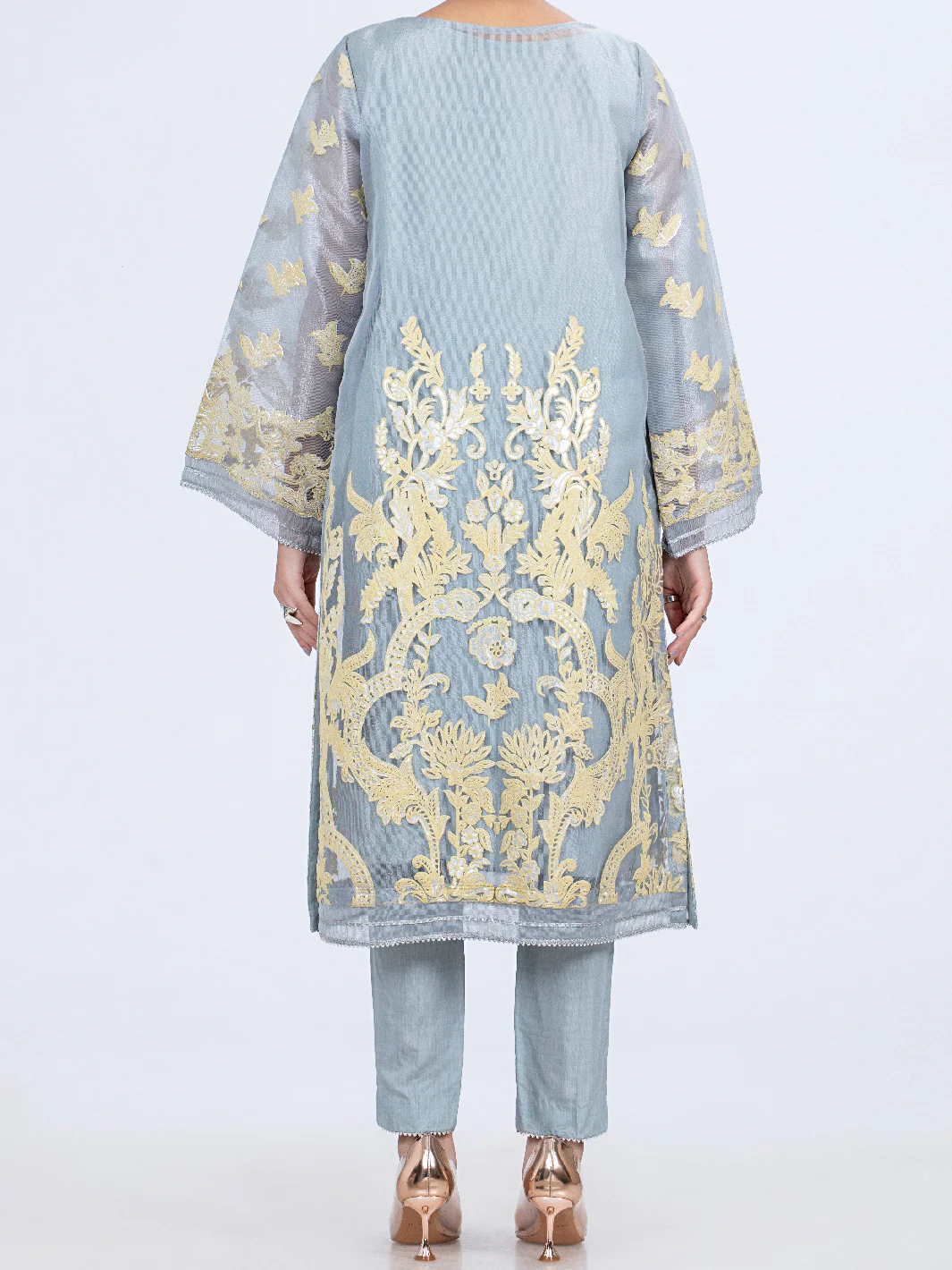 Color & Fabric: Ethereal dusty blue-grey on sheer net fabric.