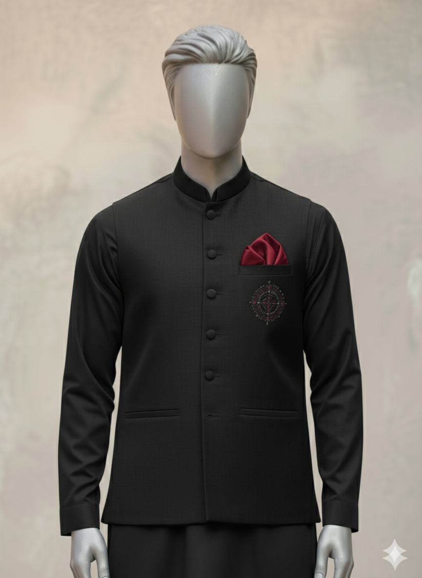 Command attention with this supremely sophisticated Black Bandhgala Waistcoat. Crafted from a finely textured, solid black fabric, the jacket offers a minimalist and sharp silhouette. The design is subtly enhanced by unique, intricate compass-style embroidery motifs in rich maroon and silver thread, positioned on the chest and lower body. Featuring a clean mandarin collar and matching tonal buttons, this piece is an exceptional choice for formal events, black-tie occasions, or upscale traditional gatherings where subtle detailing makes the biggest impact.