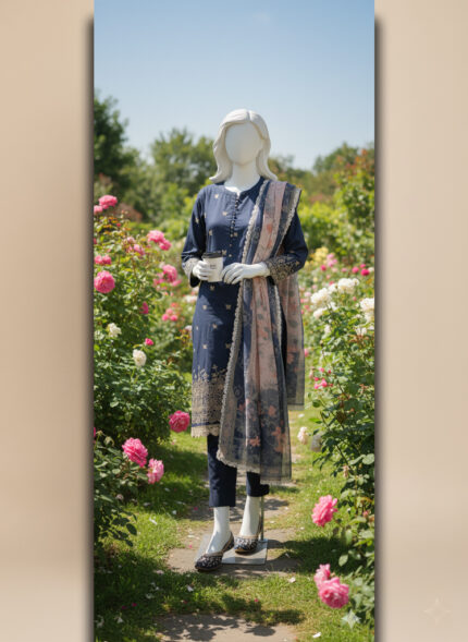 Color: Rich, solid Navy Blue with a soft, complementary print dupatta.