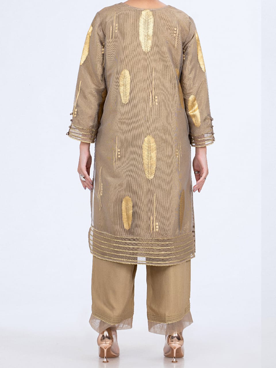 Embellishment: Intricate gold thread or zari embroidery/work on the Kurta's hem, sleeves, and neckline.