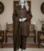 The garment in the image is a three-piece suit, commonly known as a shalwar kameez in South Asia, which includes a shirt (kameez), trousers (shalwar), and a shawl (dupatta). This particular style features a brown or ochre-toned printed suit with a teal and orange embroidered neckline. The outfit is paired with a black velvet shawl with detailed embroidery. This type of attire is often worn for formal or semi-formal occasions, especially during the winter season