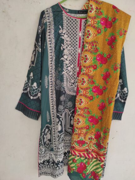 J. Junaid Jamshed is a well-known clothing brand established in Pakistan in 2002, known for reviving cultural heritage in its designs and selling women's unstitched and stitched suits, kurtis, and other apparel globally. The distinct green and white patterns on the shirt, combined with the mustard yellow and pink floral dupatta, are consistent with the style offered by the brand