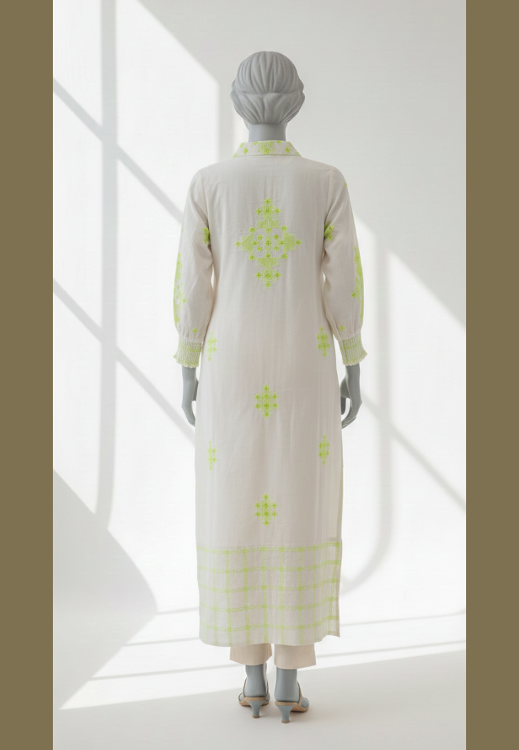 Subtle Shirt Detail: The shirt features delicate tonal embroidery or embellishment, particularly around the neckline and along the placket and cuffs.