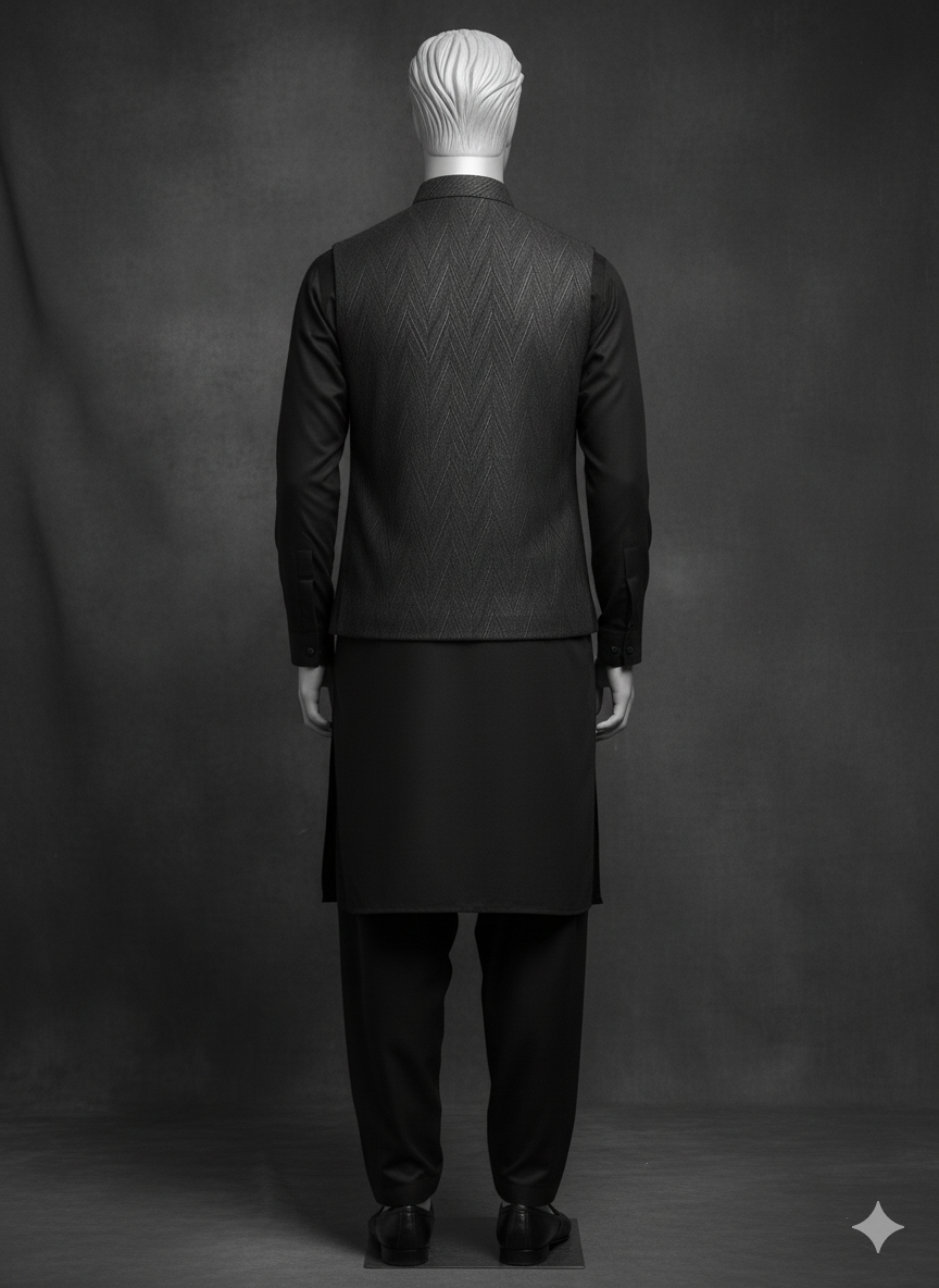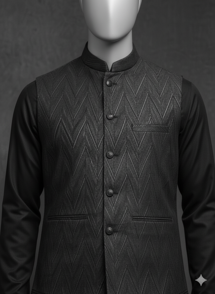 Achieve effortless sophistication with the Shadow Weave Formal Vest. This piece features a rich, deep Charcoal Grey color that is given powerful dimension by a finely textured chevron (zigzag) weave across the entire body. The subtle yet commanding pattern, paired with the sharp mandarin collar and seamlessly tonal buttons, creates a sleek, monochromatic profile. It is a highly versatile and formal waistcoat, perfect for elevating any traditional or Western ensemble at receptions, galas, or upscale evening events.