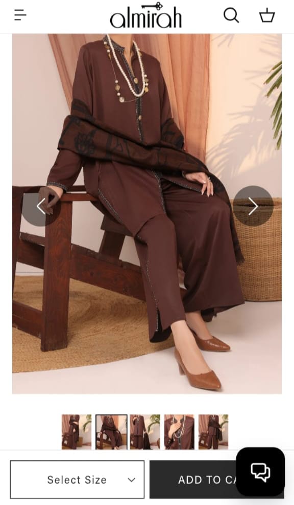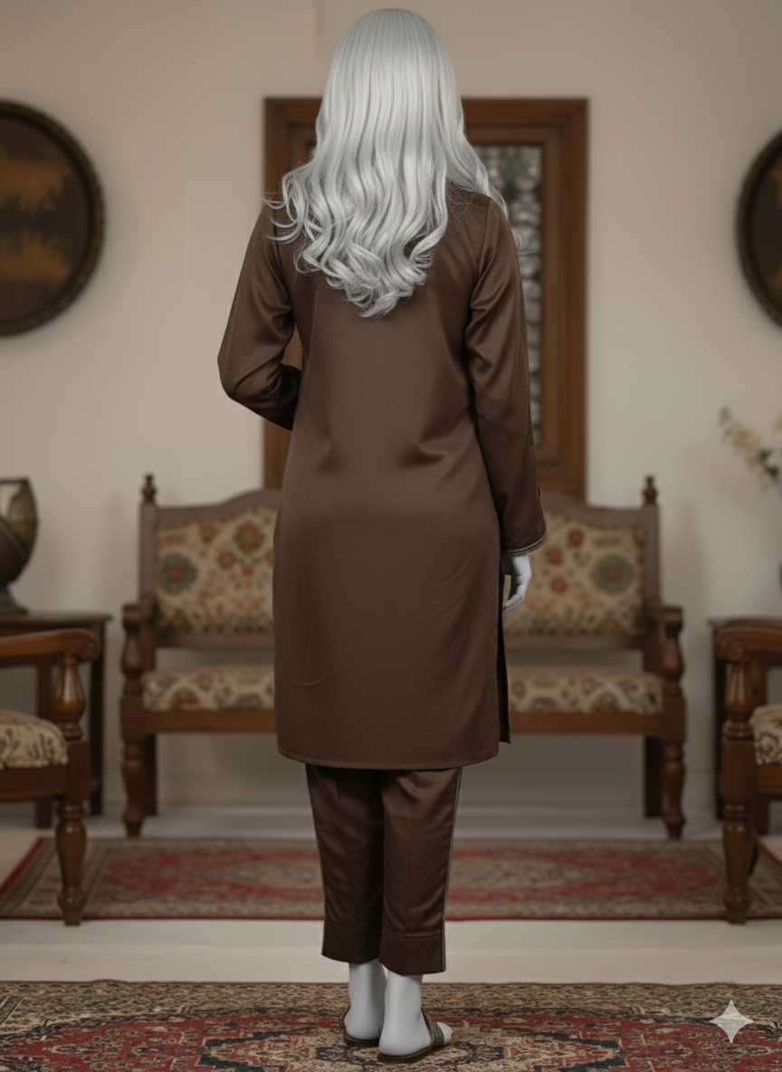This three-piece co-ord set features a short, brown tunic shirt and trousers crafted in a fluid, luxurious fabric. The shirt is distinguished by its contrast white piping along the placket, collar, and cuffs, giving it a sophisticated, pajama-inspired loungewear aesthetic. The set is completed by a matching black shawl with an intricate white chain and scroll print, making it an elegant and cohesive outfit for formal or evening wear.